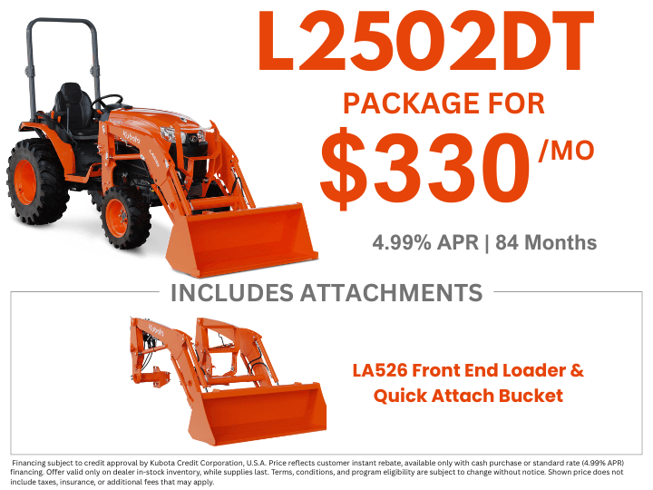 Financing subject to credit approval by Kubota Credit Corporation, U.S.A. Price reflects customer instant rebate, available only with cash purchase or standard rate (4.99% APR) financing. Offer valid only on dealer in-stock inventory, while supplies last. Terms, conditions, and program eligibility are subject to change without notice. Shown price does not include taxes, insurance, or additional fees that may apply.
