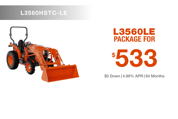 Financing subject to credit approval by Kubota Credit Corporation, U.S.A. Price reflects customer instant rebate, available only with cash purchase or standard rate (4.99% APR) financing. Offer valid only on dealer in-stock inventory, while supplies last. Terms, conditions, and program eligibility are subject to change without notice. Shown price does not include taxes, insurance, or additional fees that may apply.